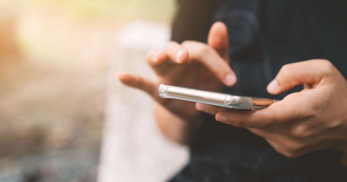 Close up woman hand hold using smart phone on outdoor park street background. Copy space of technology business and travel holiday concept. Vintage tone filter effect color style.