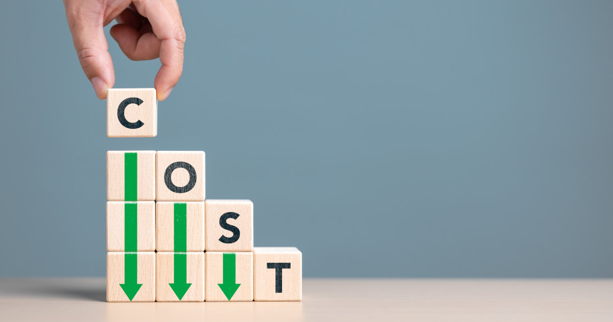 Lean or Cost reduction concept. Optimize manufacturing management. Decreasing company expense to maximize profits. Hand puts wooden cube with words cost and green down arrows. Business improvement.